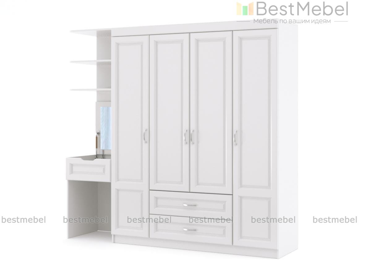 Шкаф со столом Лея 8 BMS поможет компактно разместить предметы гардероба, постельные принадлежности, бытовые вещи и все необходимое для ухода за собой. Многофункциональная модель объединила четырехдверный шкаф с полками, штангой и двумя широкими выдвижными ящиками, открытые торцевые полки и туалетный столик с откидной столешницей. Шкаф с классическими рамочными фасадами выполнен в универсальном белом цвете. Купить шкаф со столом Лея 8 BMS приглашаем выгодно в наш интернет-магазин.