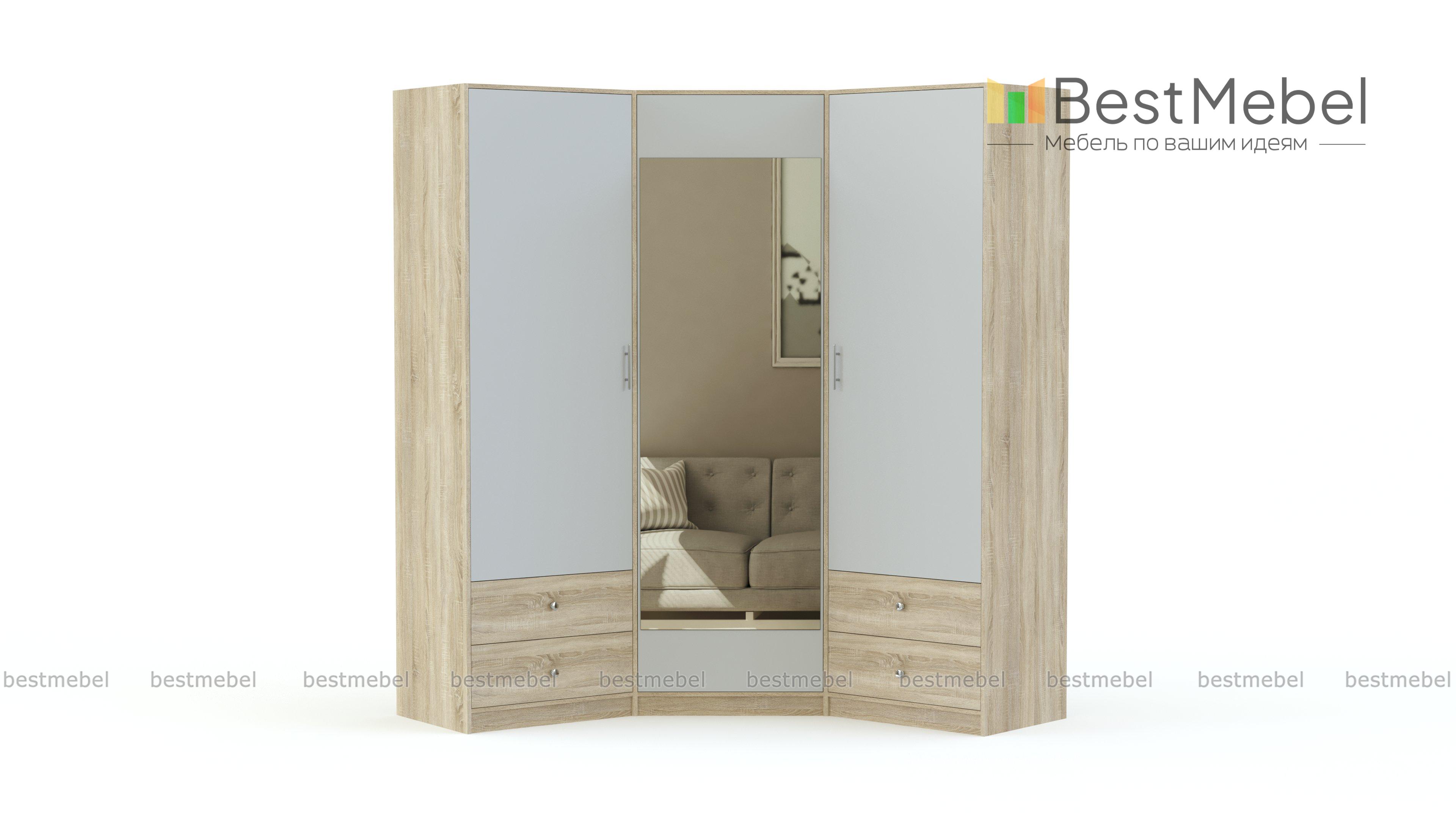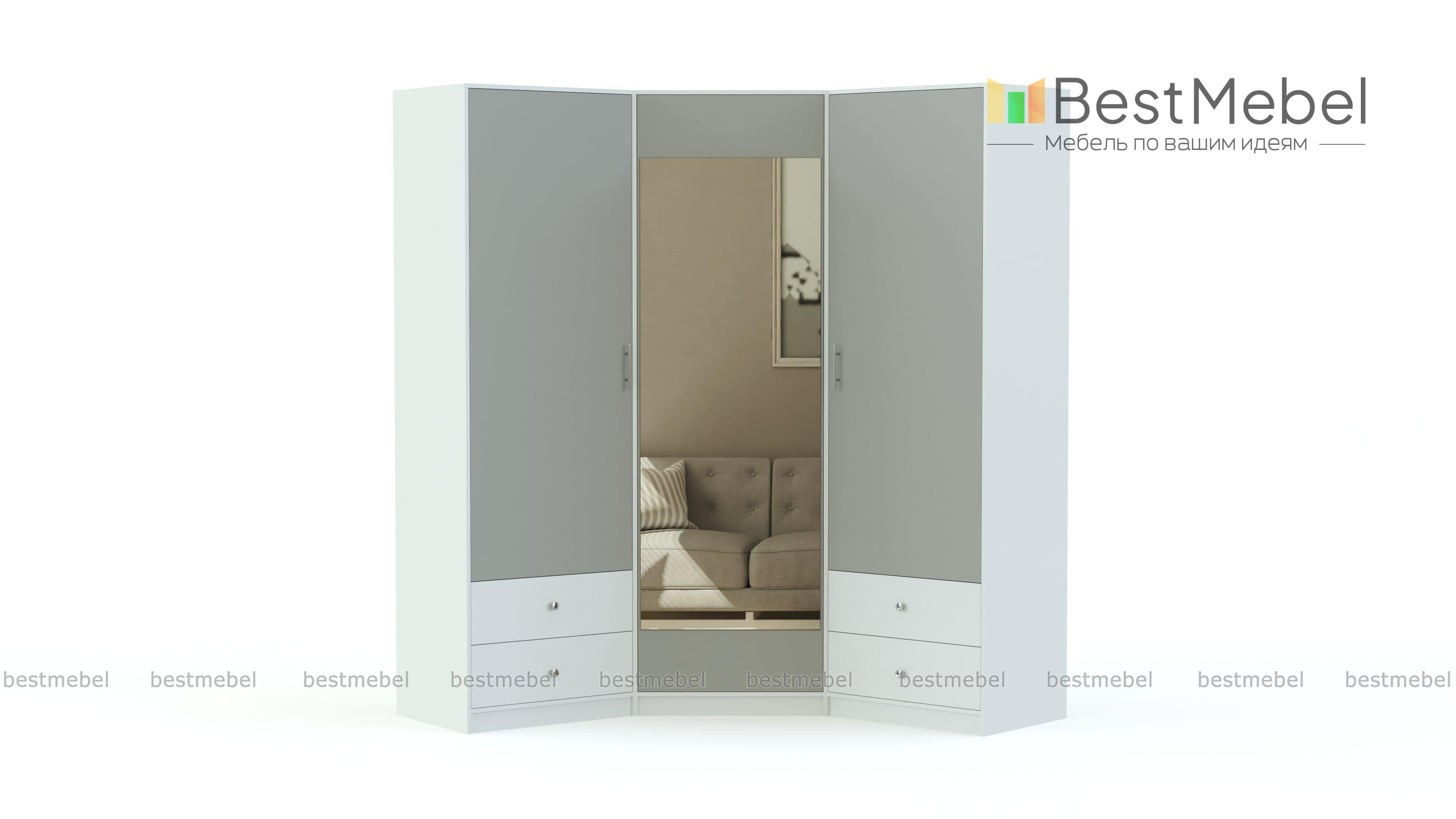 Шкаф Магия угловой BMS – элегантная модель с фасадами светлого оттенка, которая не оставит равнодушными поклонников классики. Крупногабаритный шкаф выгодно использует доступное пространство благодаря практичной конструкции и отличается вместительностью. Организовать удобное хранение белья и одежды и поддерживать в спальне порядок помогут два платяных отделения, бельевая секция и выдвижные ящики для мелочей. Центральная дверца декорирована зеркалом в полный рост и изящным рисунком. Купить шкаф Магия угловой BMS для роскошного интерьера приглашаем в наш интернет-магазин.