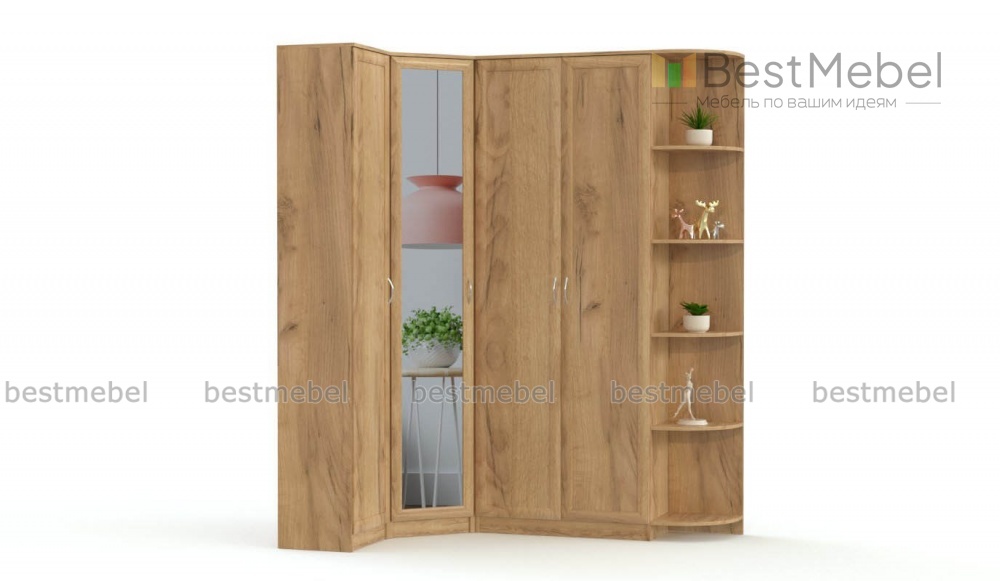 Угловой шкаф Арина 9 BMS – это удобная система хранения не только для одежды и постельных принадлежностей, но и для книг, разнообразных аксессуаров и декоративных предметов. Шкафная группа объединила угловой модуль с зеркальным фасадом, пенал, распашной двухдверный шкаф и торцевой стеллаж со скругленными полками. Модель классического дизайна с рамочными фасадами выполнена в теплых крафтовых тонах. Купить угловой шкаф Арина 9 BMS и рационально организовать пространство вам поможет наш интернет-магазин.