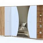 Угловой шкаф Луна 8 BMS эффектно сочетает в оформлении теплые крафтовые тона и белый с зеркальными полотнами. Декорированный фрезеровкой и полукруглыми вырезами, шкаф станет настоящим украшением современного спального интерьера. Композиция Г-образной формы включает в себя угловой однодверный модуль, четырехдверный шкаф и торцевой стеллаж с открытыми радиусными полками. Купить угловой шкаф Луна 8 BMS и компактно разместить большое количество вещей вам поможет наш интернет-магазин.