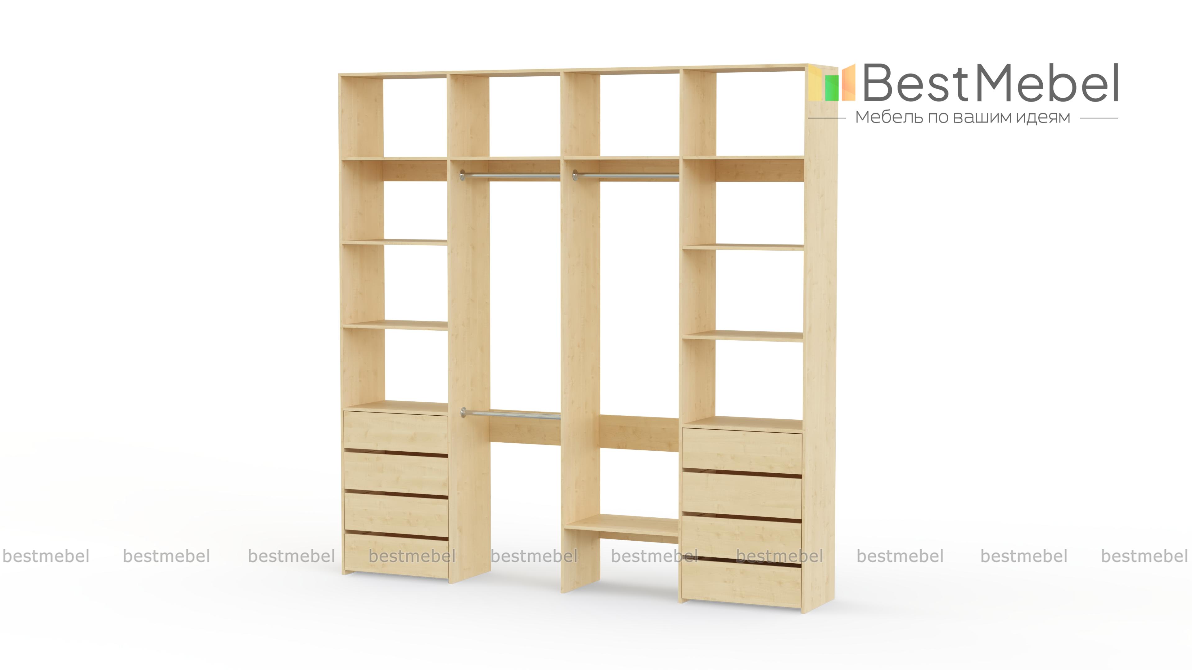 Стеллаж для одежды Мирта 21 BMS – удобный вариант для хранения одежды и обуви в гардеробной или прихожей. Два вместительных бельевых комода, платяные секции с тремя штангами и просторные открытые полки объединены в стильную конструкцию. Минимализм в отделке и базовый цвет позволяют легко комбинировать стеллаж из ламинированной ДСП с другой мебелью в доме. Купить стеллаж для одежды Мирта 21 BMS приглашаем в наш интернет-магазин с возможностью выбора цвета и габаритов.