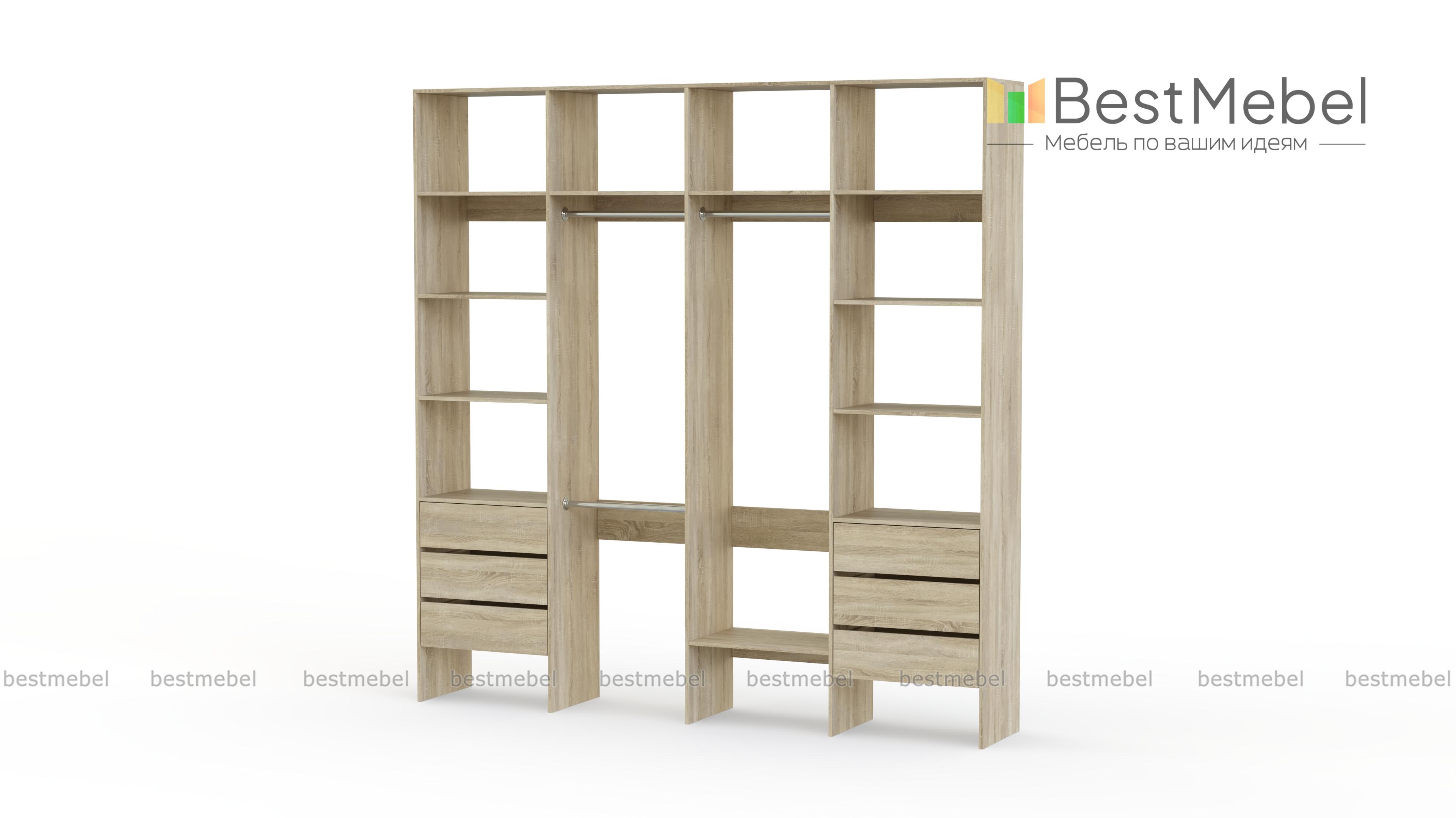 Стеллаж для одежды Мирта 65 BMS поможет легко сохранить порядок в гардеробной и входной зоне. Для компактного и аккуратного размещения вещей в стеллаже предусмотрены штанги, расположенные на двух уровнях, боковые и верхние полки, а также два ряда выдвижных ящиков. Качественная ламинированная ДСП гарантирует простоту ухода и долгий срок службы. Купить стеллаж для одежды Мирта 65 BMS, изготовленный по индивидуальным размерам, можно на сайте нашего интернет-магазина.