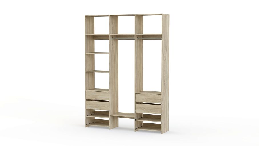Стеллаж для одежды Мирта 90 BMS станет вашим помощником в сохранении порядка. Компоновка, включающая две штанги, боковые и верхние полки, две пары ящиков и выдвижных панелей, оптимальна для аккуратного размещения одежды на вешалках и в сложенном виде, обуви и мелких аксессуаров. Нейтральный древесный оттенок ламинированной плиты подчеркивает универсальность дизайна. Купить стеллаж для одежды Мирта 90 BMS в прихожую, гардеробную, мастерскую приглашаем в наш интернет-магазин.