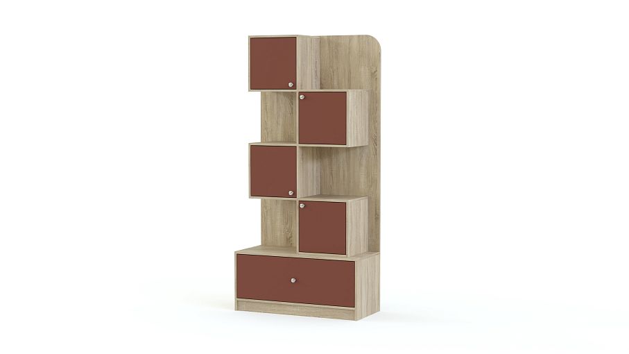 Стеллаж Леон 1 BMS дополнит интерьер современной детской удобной системой хранения для книг, игрушек, принадлежностей для творчества и многого другого. Модель оборудована широким выдвижным ящиком в основании и расположенными в шахматном порядке открытыми и глухими распашными секциями. Корпус в древесных тонах скомбинирован с яркими цветными фасадами на выбор. Купить стеллаж Леон 1 BMS и легко поддерживать в детской порядок вам всегда поможет наш интернет-магазин.