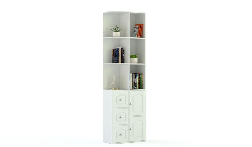 Стеллаж Юнга 7 BMS – прекрасный выбор для владельцев малогабаритных современных квартир. Компактный, но при этом вместительный стеллаж поможет с хранением книг, важных мелочей, разместит предметы декора. В основании комбинированной модели располагаются три выдвижных ящичка и глухие распашные отделения, а в верхней части – прямые и радиусные открытые полки. Купить стеллаж Юнга 7 BMS, выполненный в нейтральном белом цвете и украшенный фрезеровкой, приглашаем в наш интернет-магазин.