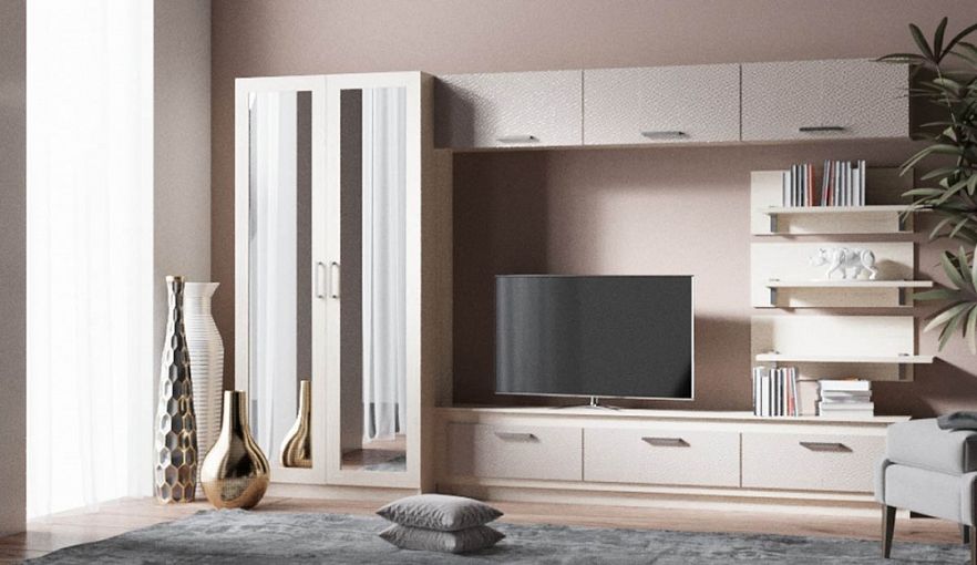 Модульная гостиная Александрия-2 BMS станет отличным решением для современных интерьеров, поможет сэкономить полезную площадь комнаты и подчеркнуть достоинства планировки. Комплект включает в себя платяной шкаф с удобными для примерок зеркальными дверцами, широкую низкую тумбу под аппаратуру, навесные открытые полки и глухие шкафчики. Фасады древесных тонов декорированы вставками с имитацией кожи. Купить модульную гостиную Александрия-2 BMS вы сможете в нашем интернет-магазине с учетом необходимых параметров.