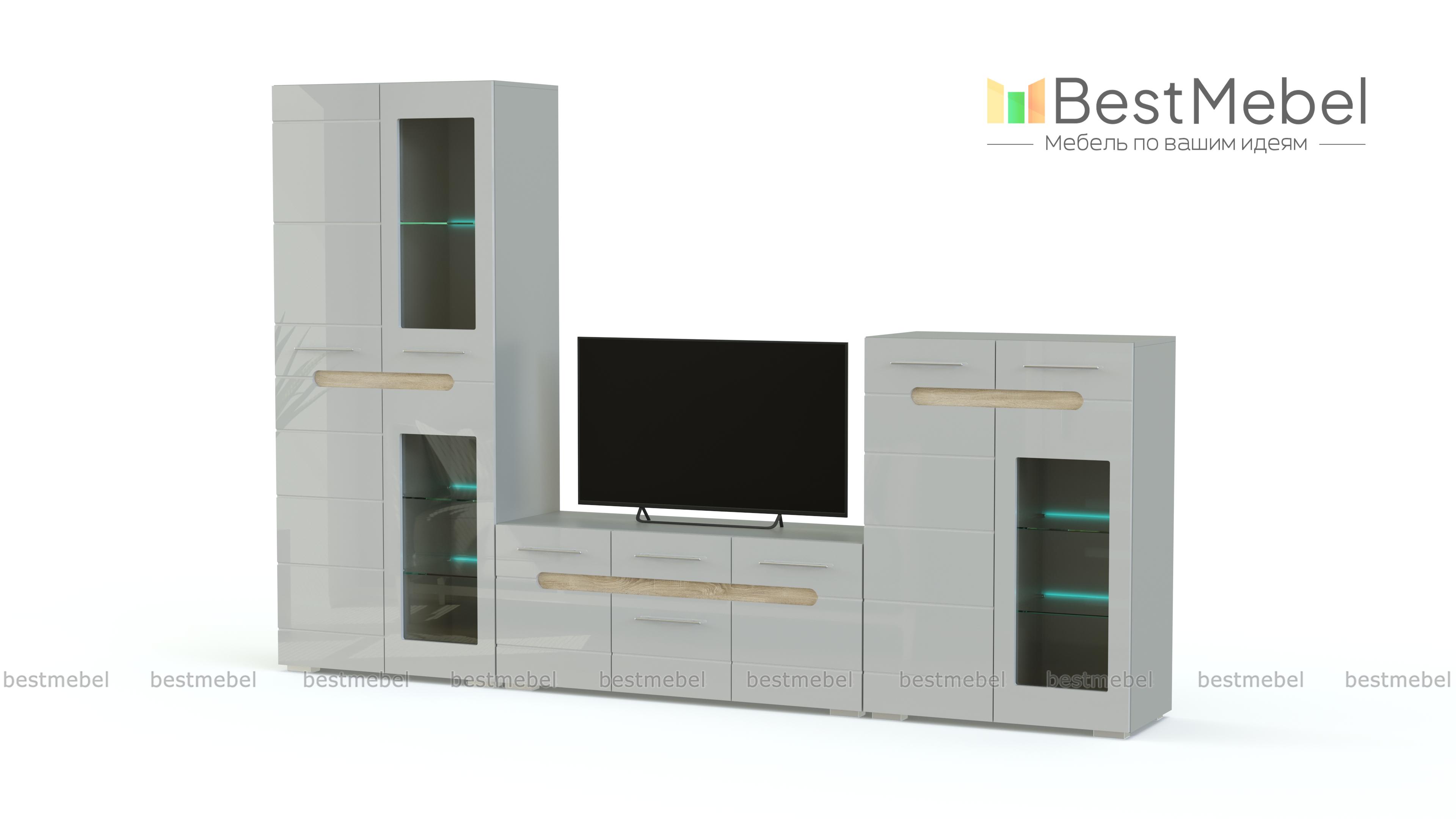Практичная и эффектная стенка Бьянко BMS станет отличным дополнением современной гостиной. Выполненная в светлых тонах, она смотрится легкой и не будет перегружать интерьер. Фрезерованные фасады с декоративными вырезами и эргономичной фурнитурой просты в уходе и долговечны. Модульная конструкция позволит максимально удобно для вас расположить отдельные элементы. В комплект входят просторная тумба под ТВ, шкаф и высокий комод, комбинированные с застекленными витринами.