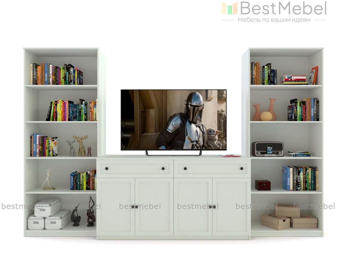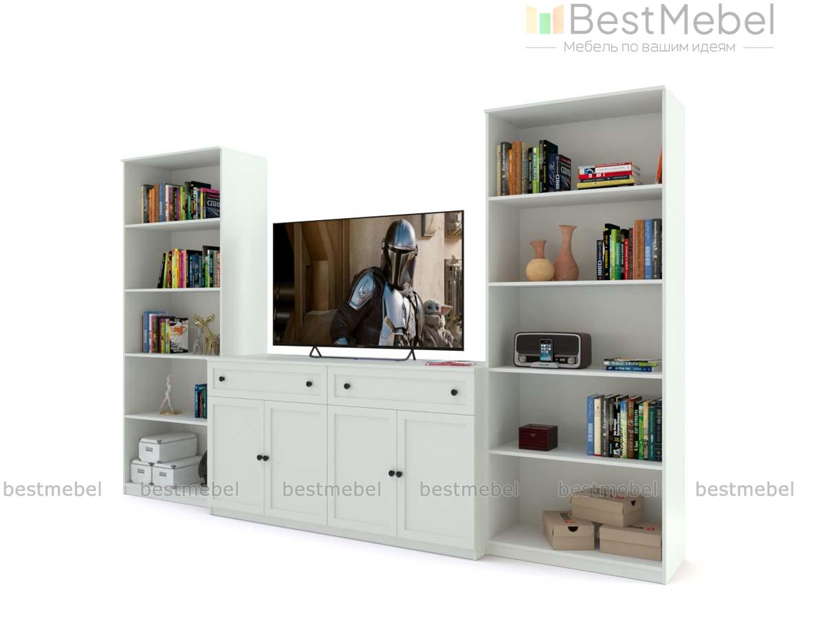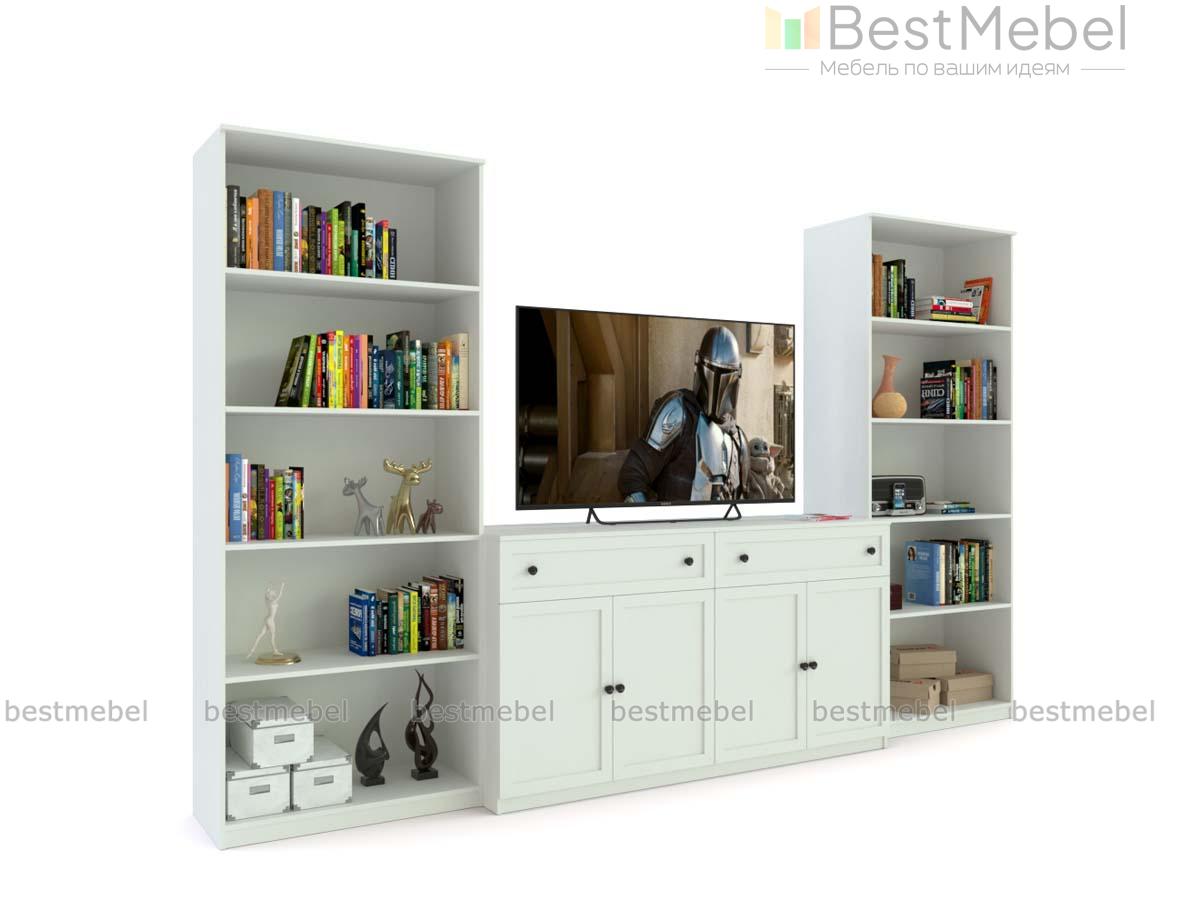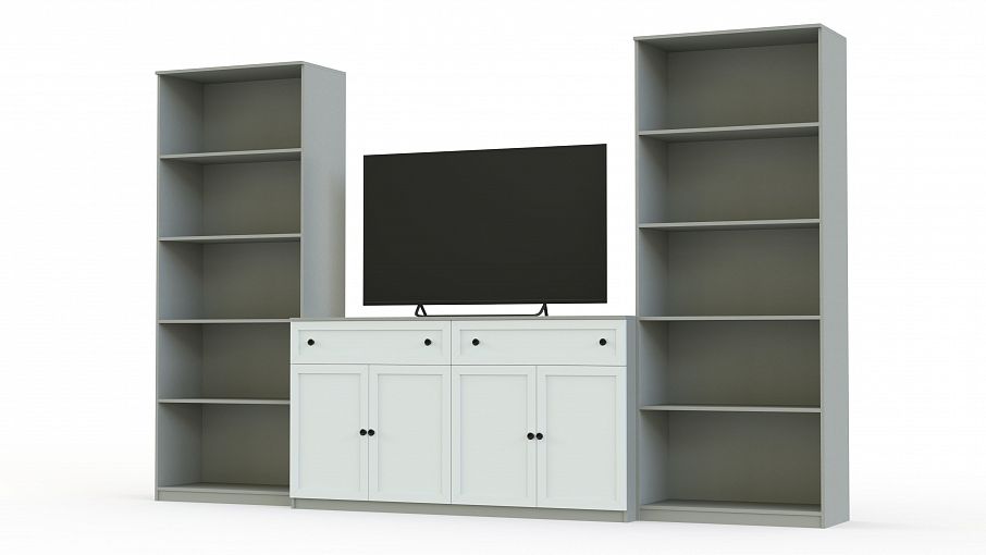 Стенка для гостиной Ханта 4 BMS представляет собой модульную композицию в скандинавском стиле, легкую и функциональную. Оформить зону ТВ, разместить книги, интерьерные украшения и множество мелочей помогут вам два высоких стеллажа и широкая тумба, оборудованная выдвижными ящиками и глухими распашными отделениями с полками. Комплект выполнен в белом цвете, фрезерованные фасады оснащены контрастными ручками-кнопками. Купить стенку для гостиной Ханта 4 BMS приглашаем к нам в интернет-магазин.