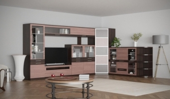 Многообразие модулей этого современного комплекта позволит решить проблемы с планировкой и грамотно организовать пространство для размещения самых разных вещей. Стильное цветовое решение и оригинальный декор добавят интерьеру вашей гостиной простоты и элегантности. В комплекте Николь 1 BMS угловой шкаф, универсальная тумба с застекленными дверцами, низкий боковой стеллаж, сервант и комбинированный модуль с тумбой под ТВ, выполненные из надежных, долговечных материалов.