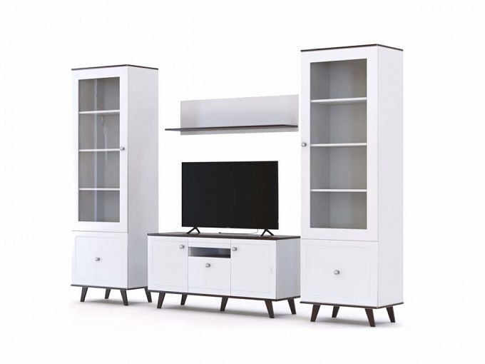 Стенка Тоффи комплектация 1 BMS гармонично впишется в интерьер небольшой современной гостиной и эффектно оформит телезону. Модульная композиция включает в себя широкую низкую тумбу под аппаратуру, навесную открытую полку для предметов декора и книг, а также две вместительные витрины с ящиками в основании. Предметы располагаются на устойчивых, чуть скошенных ножках и выполнены в белом цвете с фрезеровкой и вставками в темном оттенке венге. Купить стенку Тоффи комплектация 1 BMS приглашаем в наш интернет-магазин.