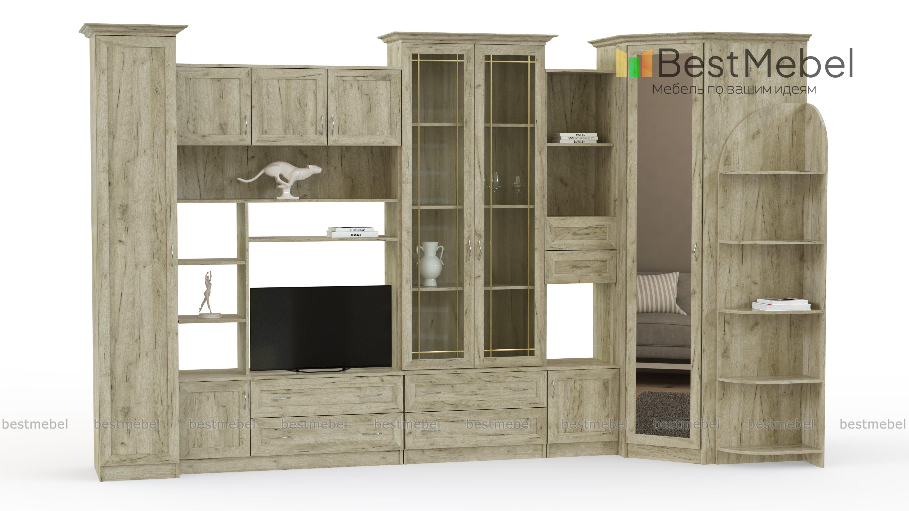 Стенка в гостиную БРАВИЯ-8 BMS понравится тем, кто ценит функциональность и традиционный декор. Крупногабаритная модель с рамочными фасадами станет выгодным приобретением для владельцев просторных гостиных в классическом стиле. В комплект входят пенал, выдвижные ящики, распашные отделения, открытые полки и ниша под ТВ. Для посуды, хрупких предметов и интерьерных украшений предусмотрена витрина, а для одежды – практичный угловой шкаф с зеркальной дверцей, дополненный торцевым стеллажом. Купить стенку в гостиную БРАВИЯ-8 BMS недорого приглашаем в наш интернет-магазин.
