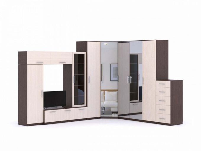 Стенка в гостиную Эльма 37 BMS – это угловая модульная композиция, включающая в себя все необходимое для оформления ТВ-зоны и удобную систему хранения. Лаконичная по дизайну и выполненная в контрастных древесных тонах, стенка легко вписывается в современные интерьеры. Комплект состоит из тумбы под аппаратуру, витрины, навесных полок и шкафной группы с одним угловым и прямыми модулями с полками и штангами. Зеркальный фасад шкафа визуально расширит границы комнаты. Купить стенку в гостиную Эльма 37 BMS приглашаем в наш интернет-магазин.