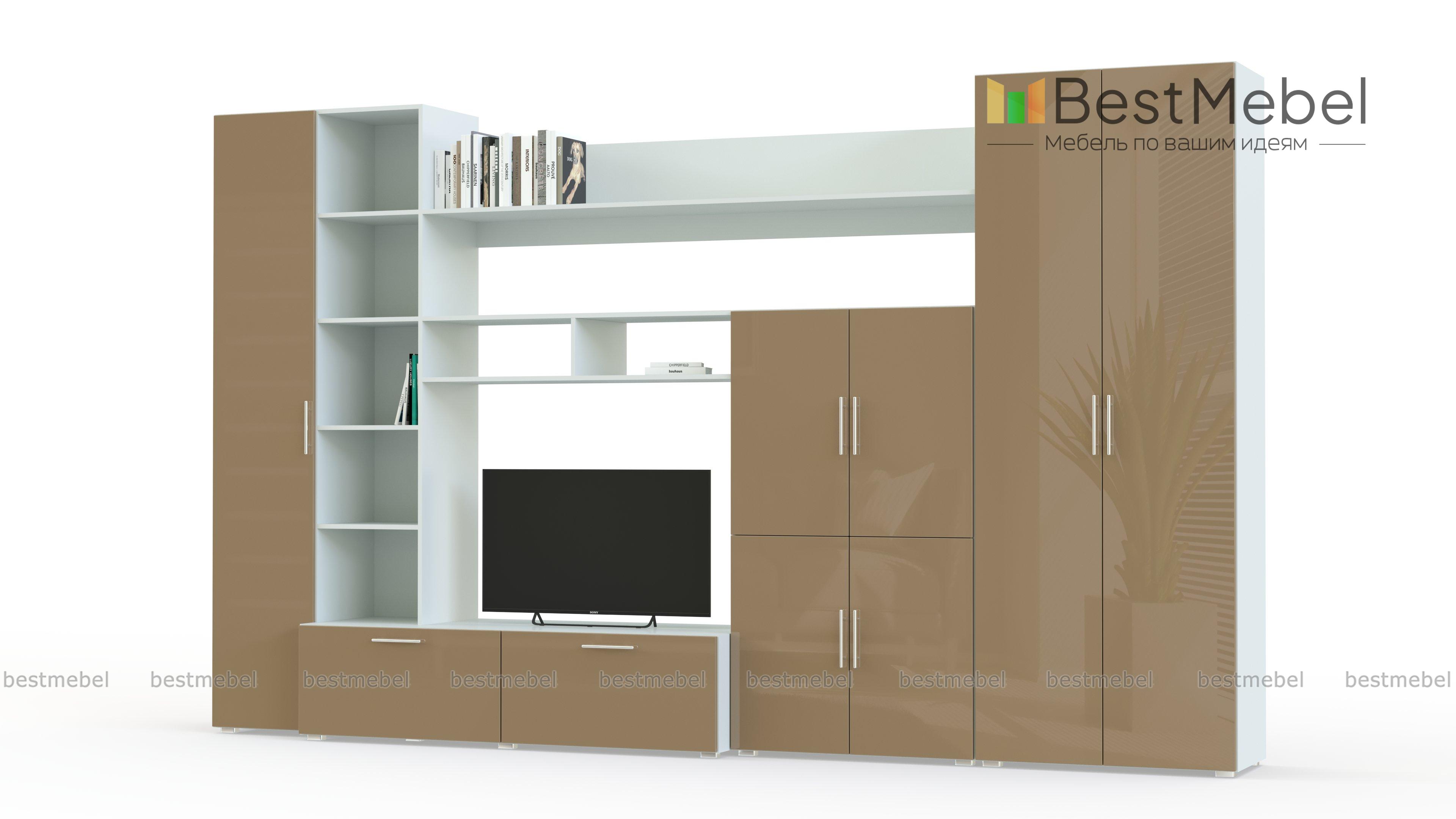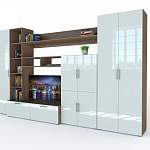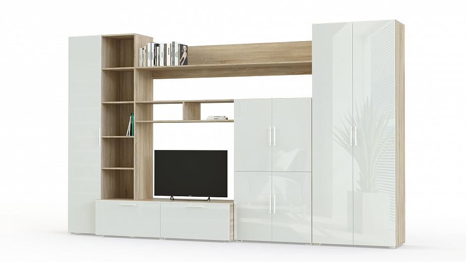Стенка Ватсон 21.1 BMS подходит как небольшим, так и просторным помещениям благодаря лаконичному дизайну и визуальной легкости. Прямая композиция с белоснежными глянцевыми фасадами и корпусом темных древесных тонов включает в себя все необходимое для оформления зоны ТВ и хранения вещей. Это распашной платяной шкаф, распашной шкаф с полками, тумба под аппаратуру, колонка и разнообразные открытые полки для книг и интерьерных украшений. Купить стенку Ватсон 21.1 BMS по доступной цене приглашаем к нам в интернет-магазин.