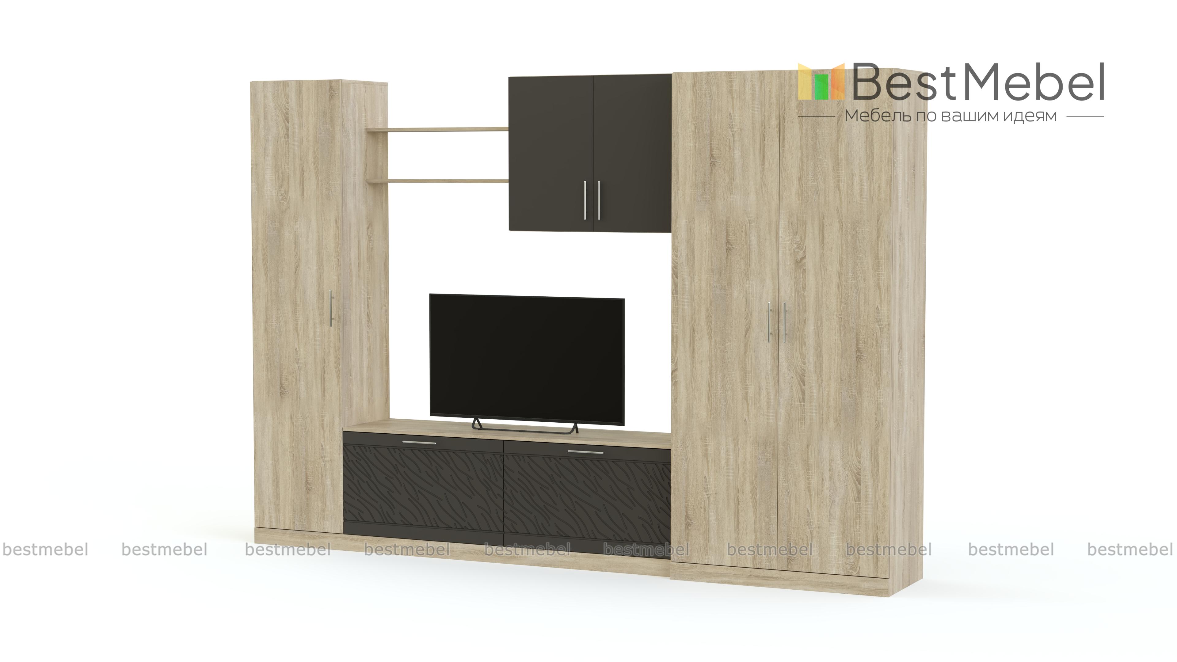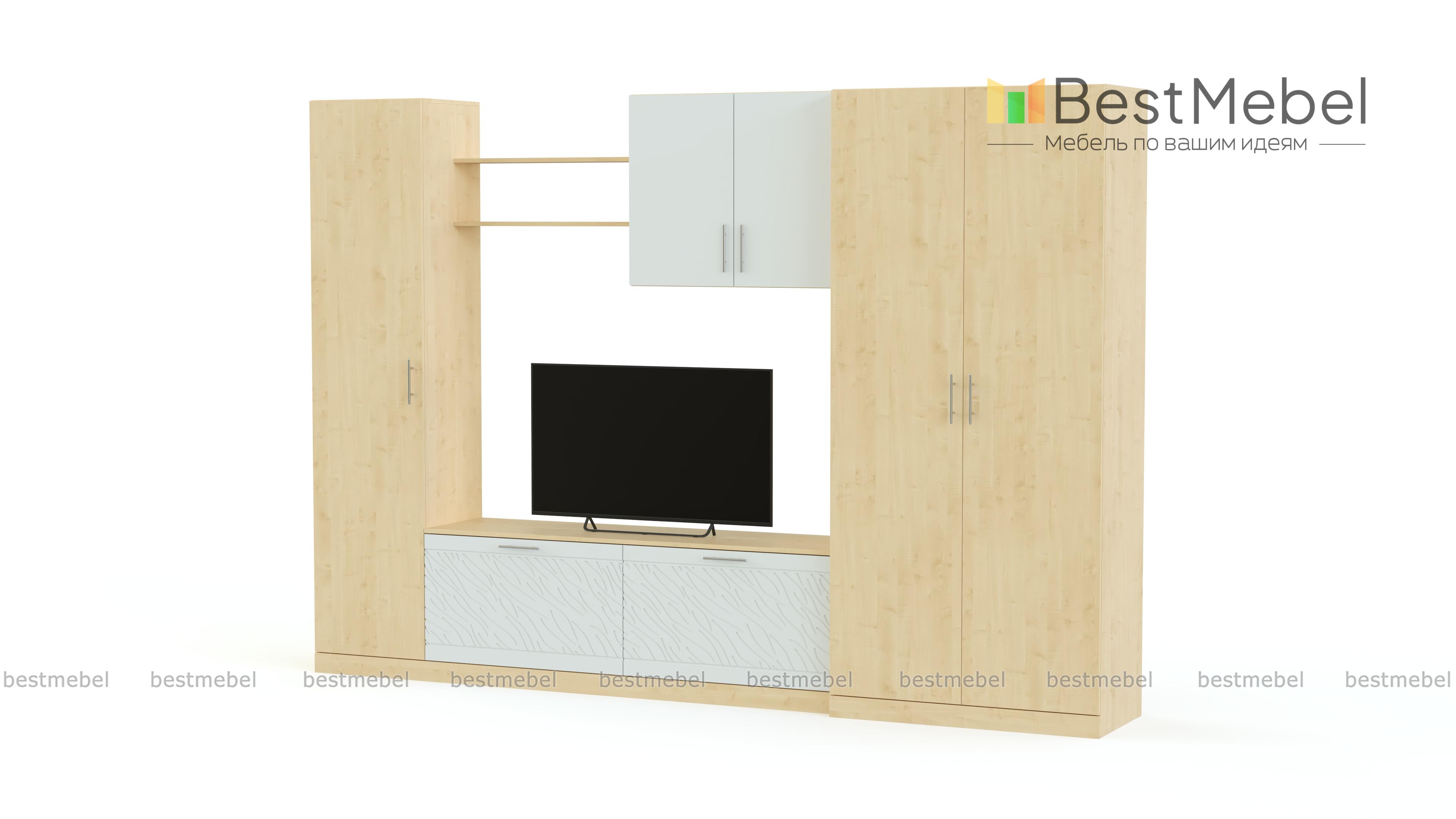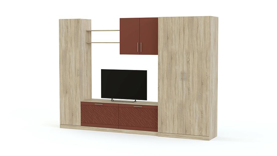 Стенка Вельвет 14 BMS из популярной современной серии гармонично сочетает цветные поверхности, матовые под массив дерева и рельефный рисунок. Вместительная модель объединила в единую композицию с нишей под ТВ в центре двухдверный платяной шкаф, тумбу, навесной шкаф, открытую полку и бельевую колонку. Вы сможете компактно разместить все необходимое, не перегружая интерьер лишними деталями и добавив в обстановку яркие акценты. Купить стенку Вельвет 14 BMS, подобрав цветовое решение, вы сможете в нашем интернет-магазине.