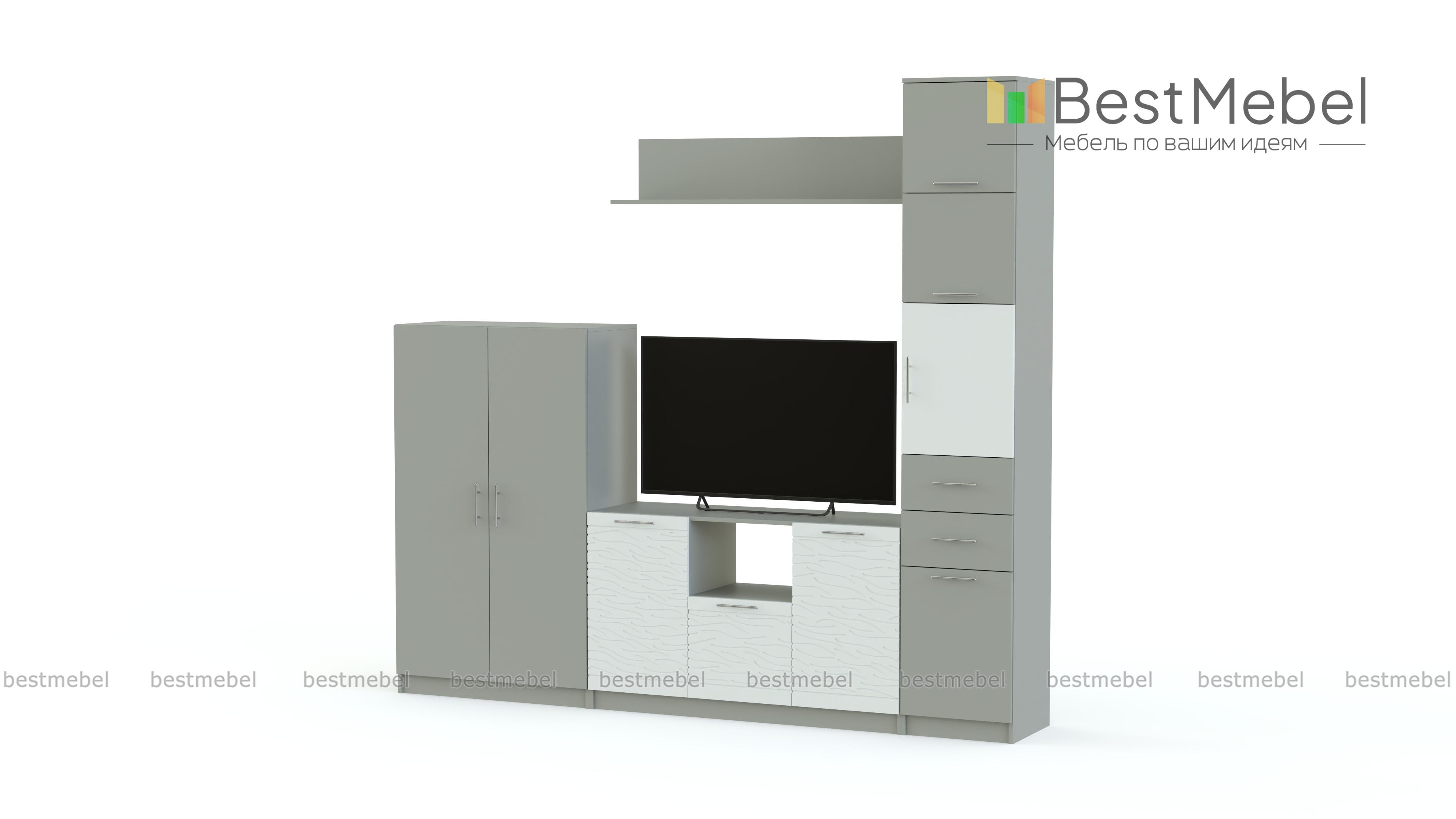Стенка Вельвет 4 BMS – модульная композиция для светлого и визуально легкого современного интерьера. Поклонникам минимализма придутся по душе простота формы и высокая функциональность. Комплект оборудован высокой комбинированной колонкой, вместительной тумбой под ТВ, распашным комодом и навесной открытой полкой. Особенно эффектный вид стенке придают разноуровневость и сочетание древесных тонов с темными фасадами, декорированными рельефным рисунком. Купить стенку Вельвет 4 BMS, стильную и надежную, вам поможет наш интернет-магазин.