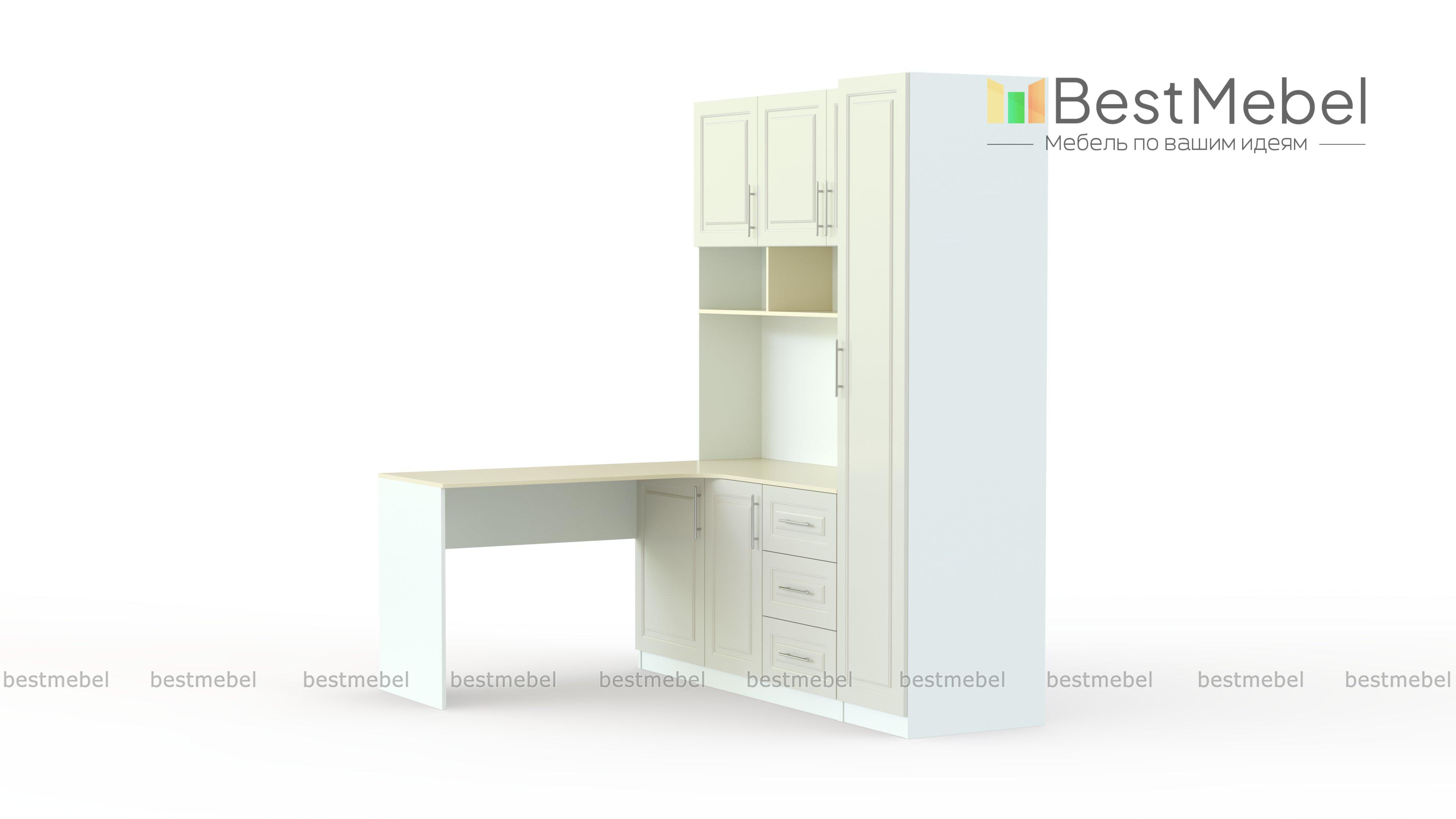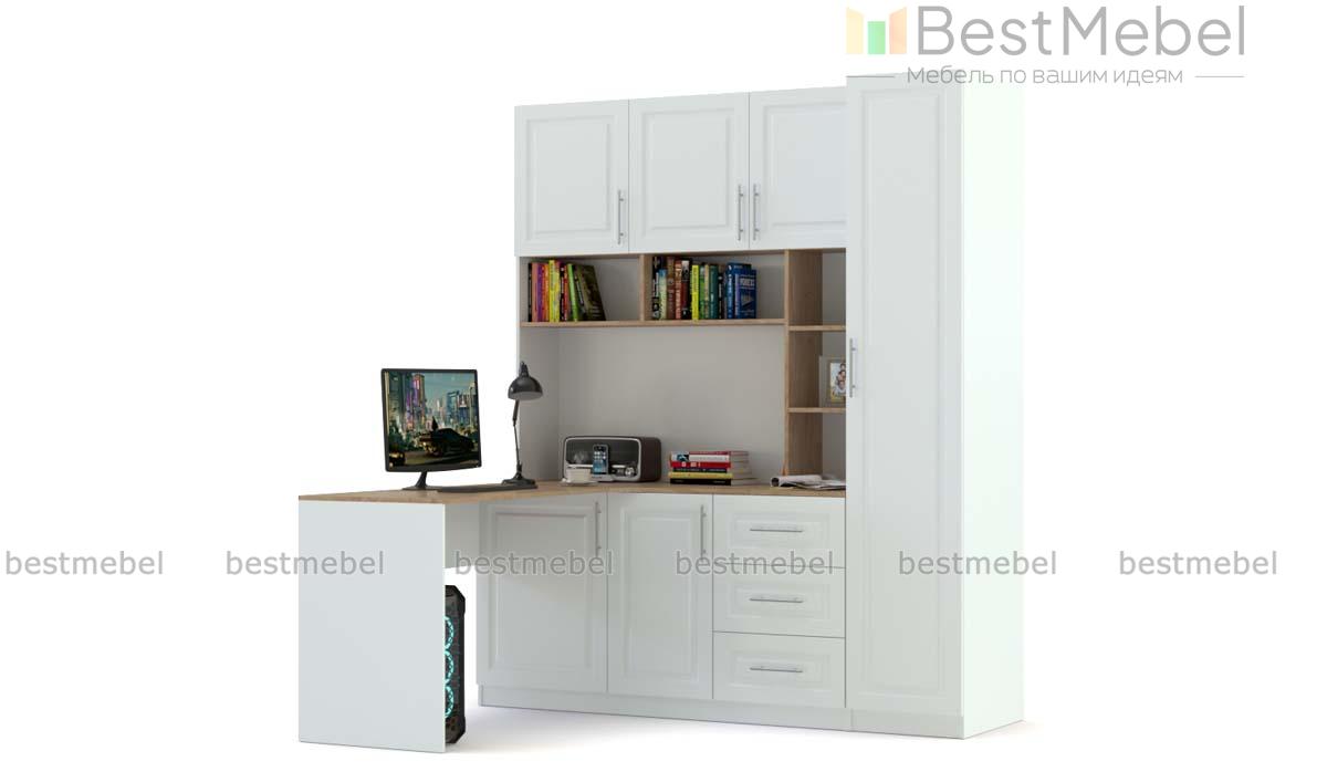Компьютерный стол Классик 12 BMS сочетает в себе практичную конструкцию и элегантный классический дизайн. Угловая модель объединила просторную столешницу с распашной и оборудованной выдвижными ящиками тумбами, открытыми книжными полками, шкафчиками с глухими дверцами и пеналом. Белоснежные фасады с рамочной фрезеровкой дополнены элементами в древесных тонах. Купить компьютерный стол Классик 12 BMS и создать комфортный и эстетичный интерьер вам поможет наш интернет-магазин.
