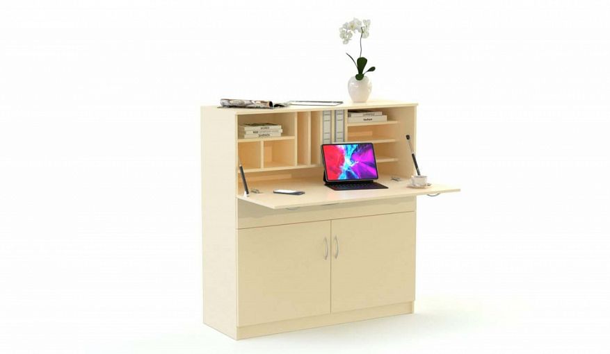 Компьютерный стол-трансформер Бонни 2 BMS – прекрасный выбор для создания светлого и функционального интерьера. В закрытом виде модель занимает совсем немного места и представляет собой комод с двухдверным распашным отделением в нижней части и откидной столешницей. За лаконичным фасадом скрыты выдвижные ящики и ниши разных размеров для удобного хранения рабочих материалов. Купить компьютерный стол-трансформер Бонни 2 BMS для комфортной работы за ноутбуком вы сможете на сайте нашего интернет-магазина.