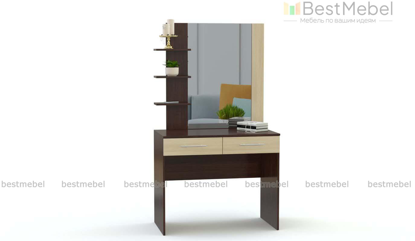 Туалетный стол Азалия К 1 BMS станет элементом дизайна современной спальни и сделает уход за собой комфортным. Прямоугольный столик, выполненный в контрастных древесных тонах, дополнен большим зеркалом. Для удобного хранения косметики, украшений и аксессуаров конструкцией предусмотрены два выдвижных ящика и расположенные на боковой панели открытые полочки. Купить туалетный стол Азалия К 1 BMS приглашаем в наш интернет-магазин с выбором фурнитуры и цвета по каталогу.
