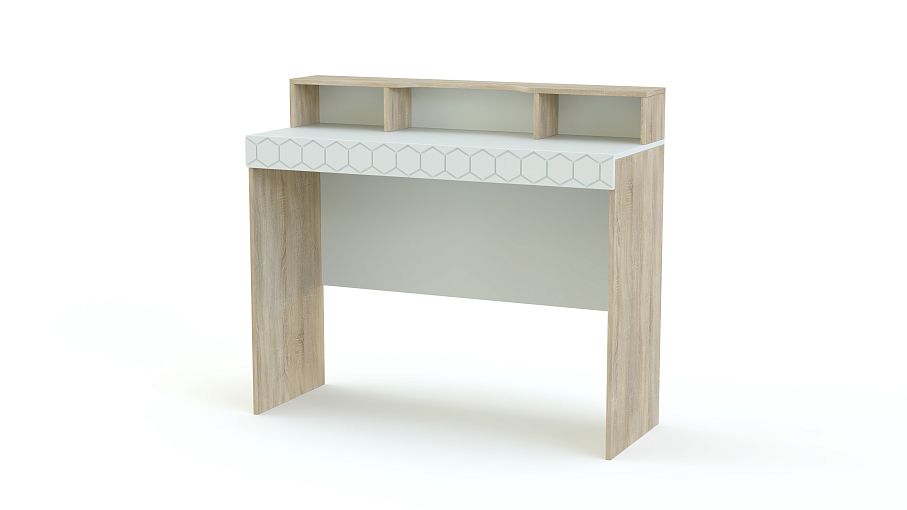 Туалетный стол Монте 5 BMS выполнен в древесных тонах теплой светлой гаммы и декорирован по фасаду накладкой с оригинальным фрезерованным орнаментом. Для удобного хранения мелочей элегантный столик оборудован широкой двухуровневой столешницей с полочкой, к которой крепится зеркало, и вместительными нишами. Износостойкость поверхностей и простота ухода помогут надолго сохранить модели эстетичный вид. Купить туалетный стол Монте 5 BMS и сделать спальный интерьер функциональнее вам поможет наш интернет-магазин.
