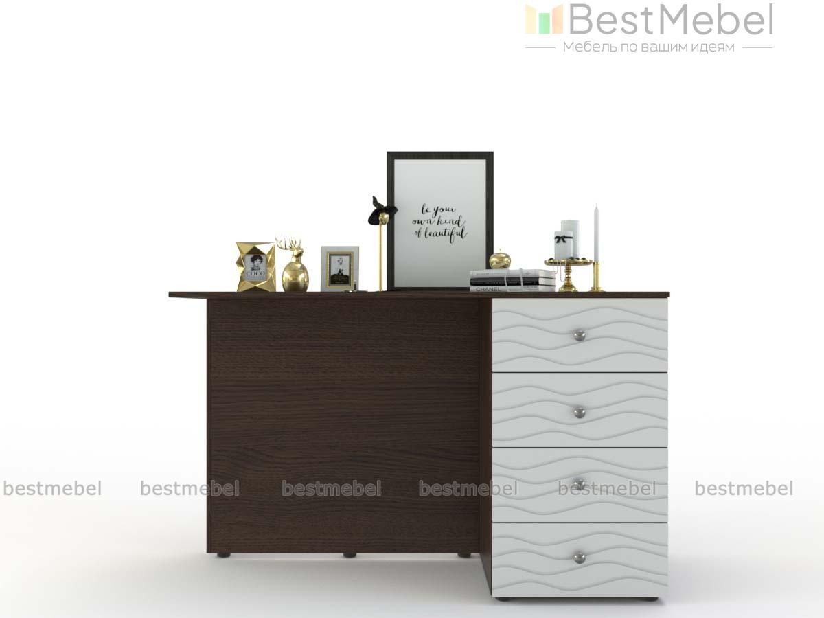Туалетный столик Соната 9 BMS эффектно сочетает разные цвета и фактуры – корпус древесных тонов и глянцевый фасад с волнообразной фрезеровкой. Оборудованный прямоугольной широкой столешницей и глухой задней стенкой, столик опирается на тумбу с четырьмя выдвижными ящиками для хранения уходовых средств, аксессуаров и прочих мелочей. Купить туалетный столик Соната 9 BMS и дополнить спальный гарнитур практичным и стильным предметом вам всегда поможет наш интернет-магазин.