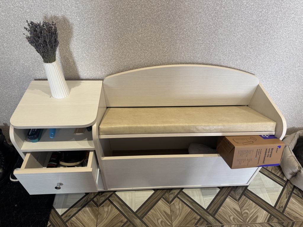 Тумба для обуви классная.Очень симпатично смотрится. Удобная и вместительная.Сидушка мягкая экокожа светлая.